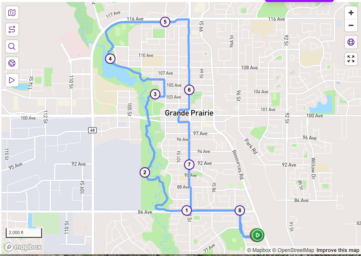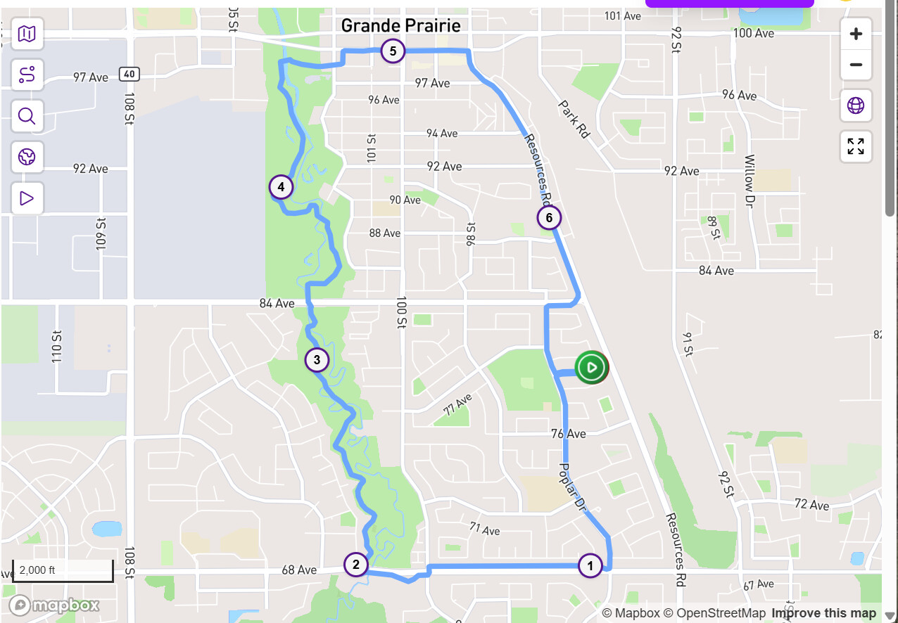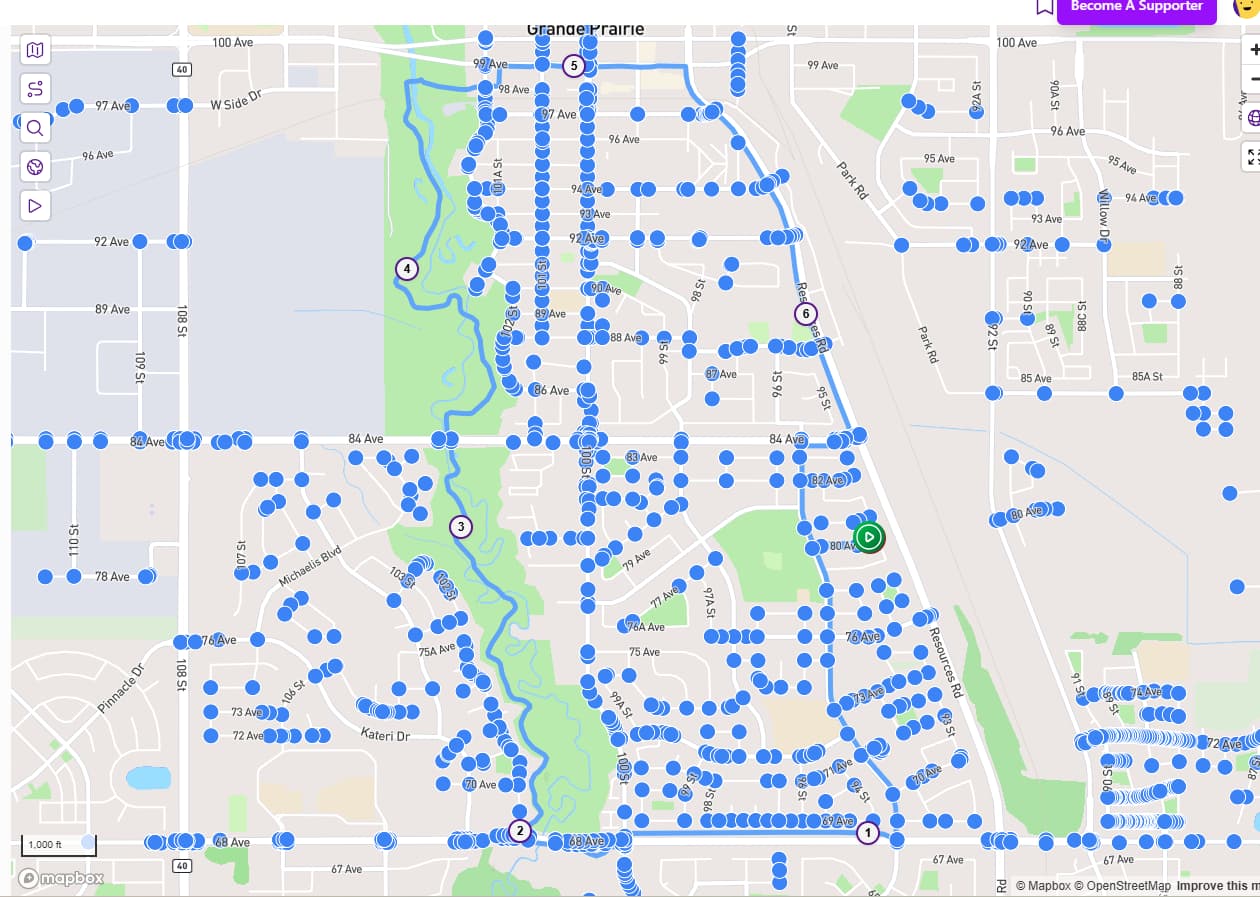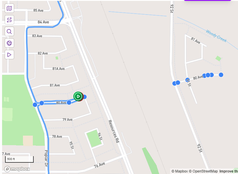 This is a screen shot of 80th avenue. I only ran part of it. But I don’t get credited nodes for running any of it. I don’t think I ran any one complete street in Grande Prairie.
