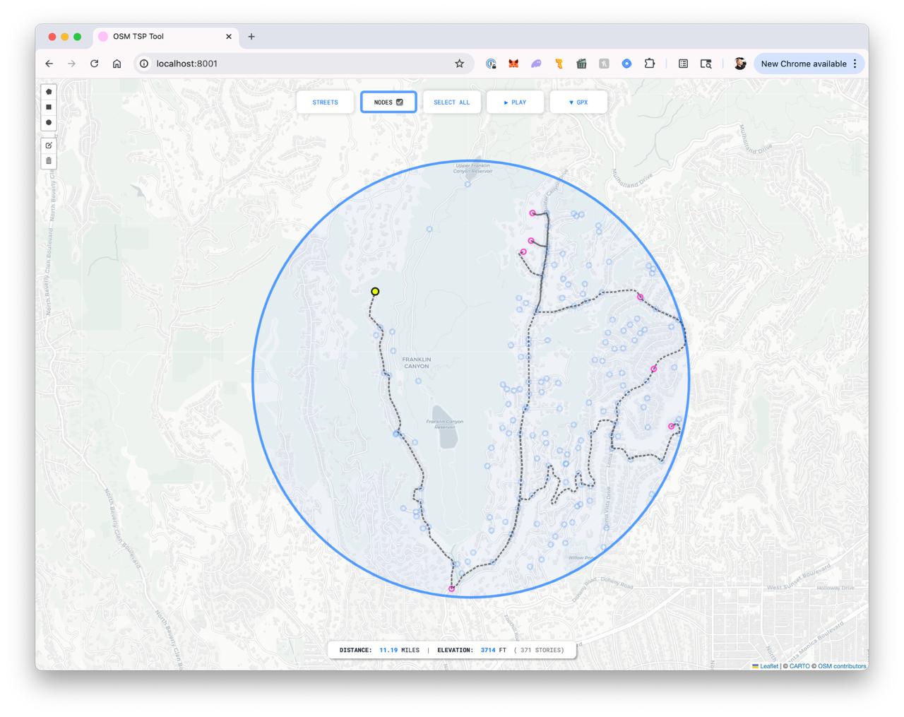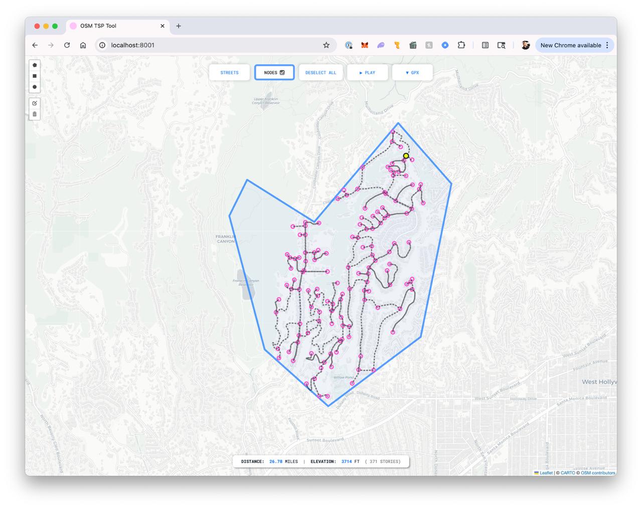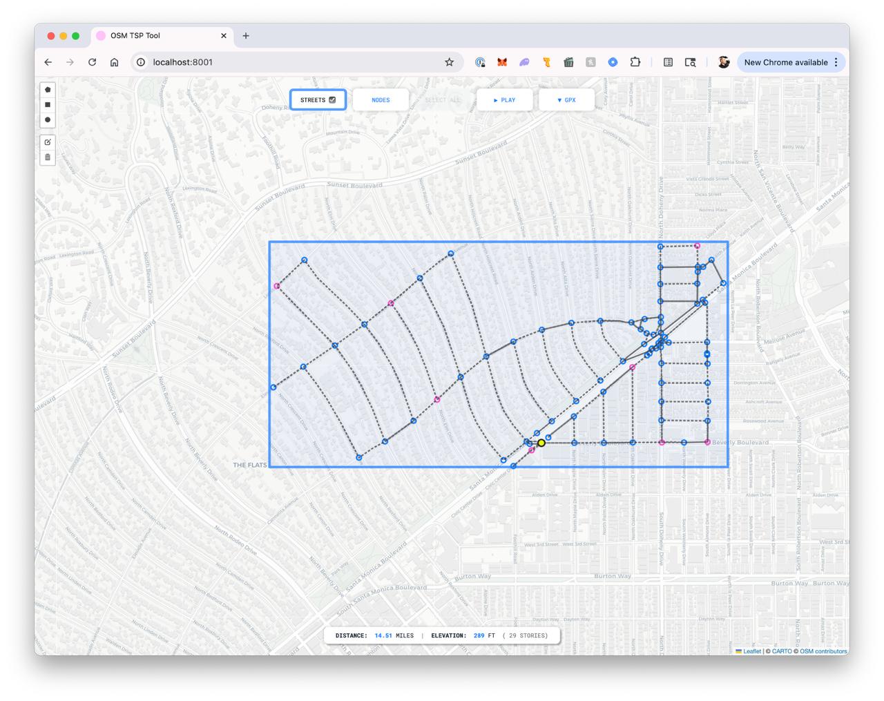 I’m working to complete all of Los Angeles and want to be as efficient as possible given the time and effort required. About a year ago, I built a web-based tool that runs locally. This was before recent advances in Claude Code / agent-based coding, so there is room to improve it for sure. The main constraint is compute, from what I understand: this is a complex logistics problem that companies like FedEx, UPS, and DHL have spent decades optimizing.