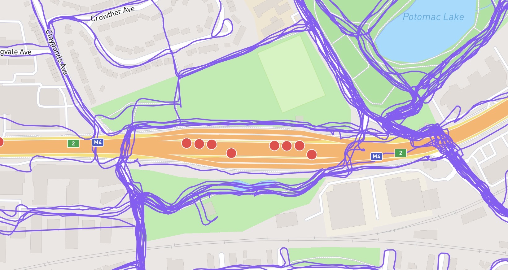 This is the path Way: 915904462 | OpenStreetMap that diverges a bit too far from the most southerly carriageway of two and so I missed the nodes on it.