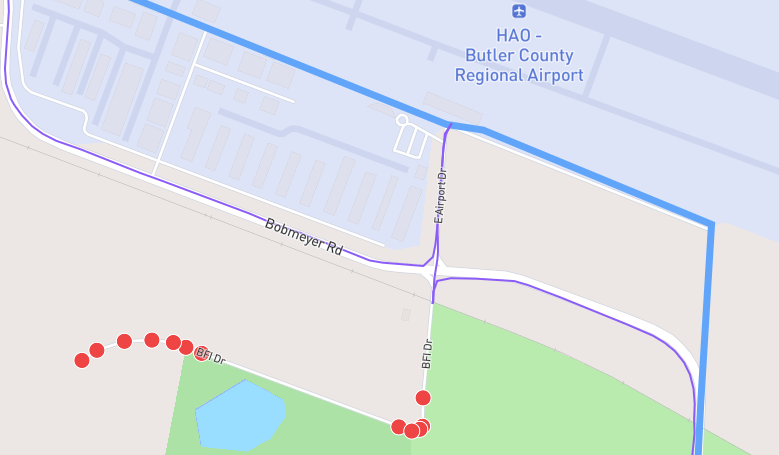 I’ve run 656 of the 657 streets in Fairfield, Ohio. The one street I haven’t been able to run, BFI Dr., is a gated private road. This can be seen on the Google Maps Street view. There is a fence with barbed wire and a locked gate with a sign across it saying to not enter. Can you mark this as a private road and remove it as an accessible road?