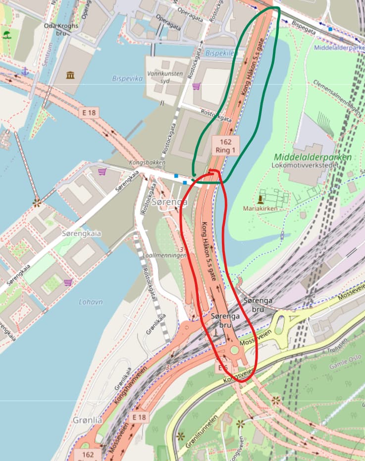 A couple if weeks ago there was a massive update in the road network. Some highly trafficked roads where there should be no pedestrians used to be excluded from the network, but now many dangerous roads have been included. Some of them are marked “Trunk” in OSM. One road, “Haakon V’s gate” in Oslo, starts as street with pavements, but transits into a brigde that leads into the motorway systems that of course does not allow pedestrians. Maybe this is the problem?
