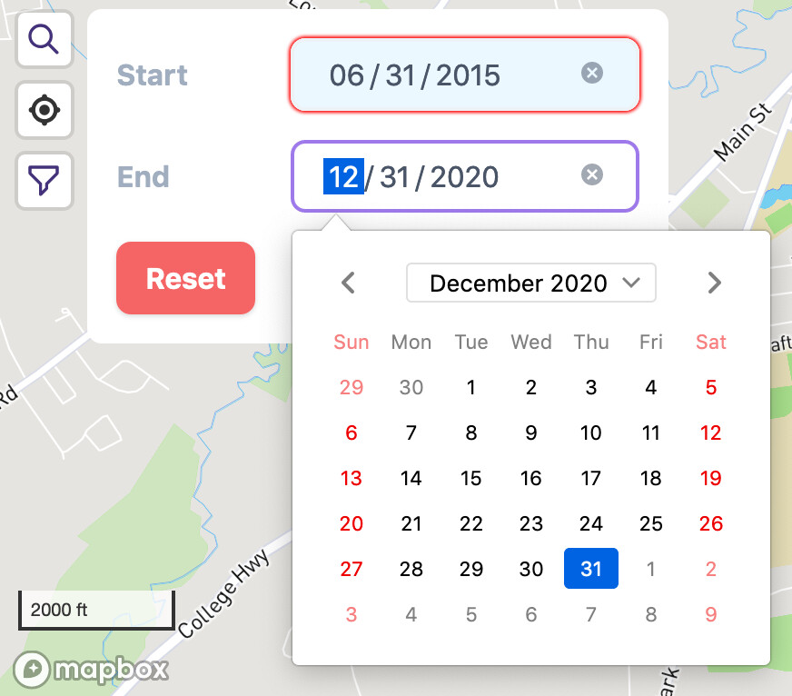 re 2: When I was playing around with #1, if I try to filter with start=2015-06-31 (not a real date), end=2015-07-02, the map does exclude some things but still shows almost everything. It took me a while to realize I was messing up the start date. Would it be possible to show an error message if a date in the filter fields is invalid?