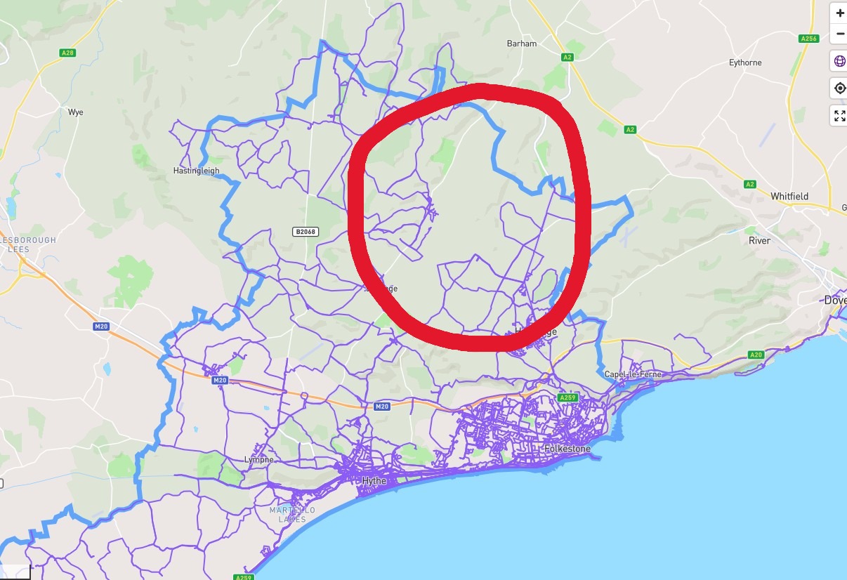 I’ve picked up all the nodes in this area although I’ve manually completed the last of Elham Valley Road Elham Valley Road - CityStrides where I’d more than likely be bounced off into a hedge at 60mph by some rep in his BMW or squashed under a bus on this busy route.