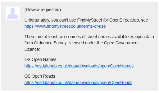 Reading through a few comments here and on the OSM forums I can’t determine whether using Find My Street is acceptable. Would I be okay to add a few names using FMS as source material?
