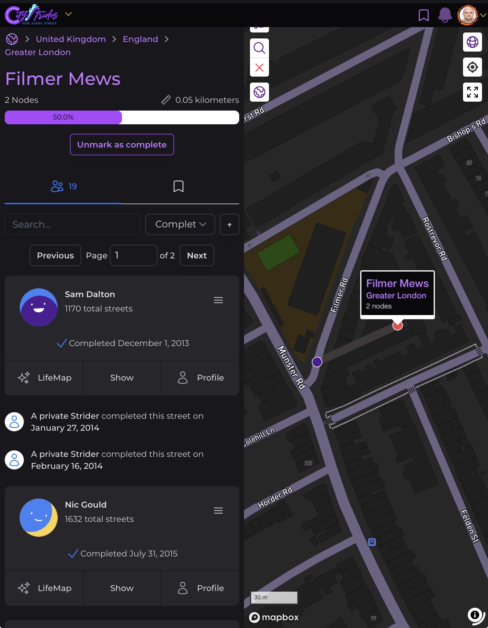 Filmer Mews has an “Unmark as complete” button, which means you marked it as manually complete. Since it’s marked as complete, it will not appear via Node Hunter - completed streets do not have their incomplete nodes displayed.