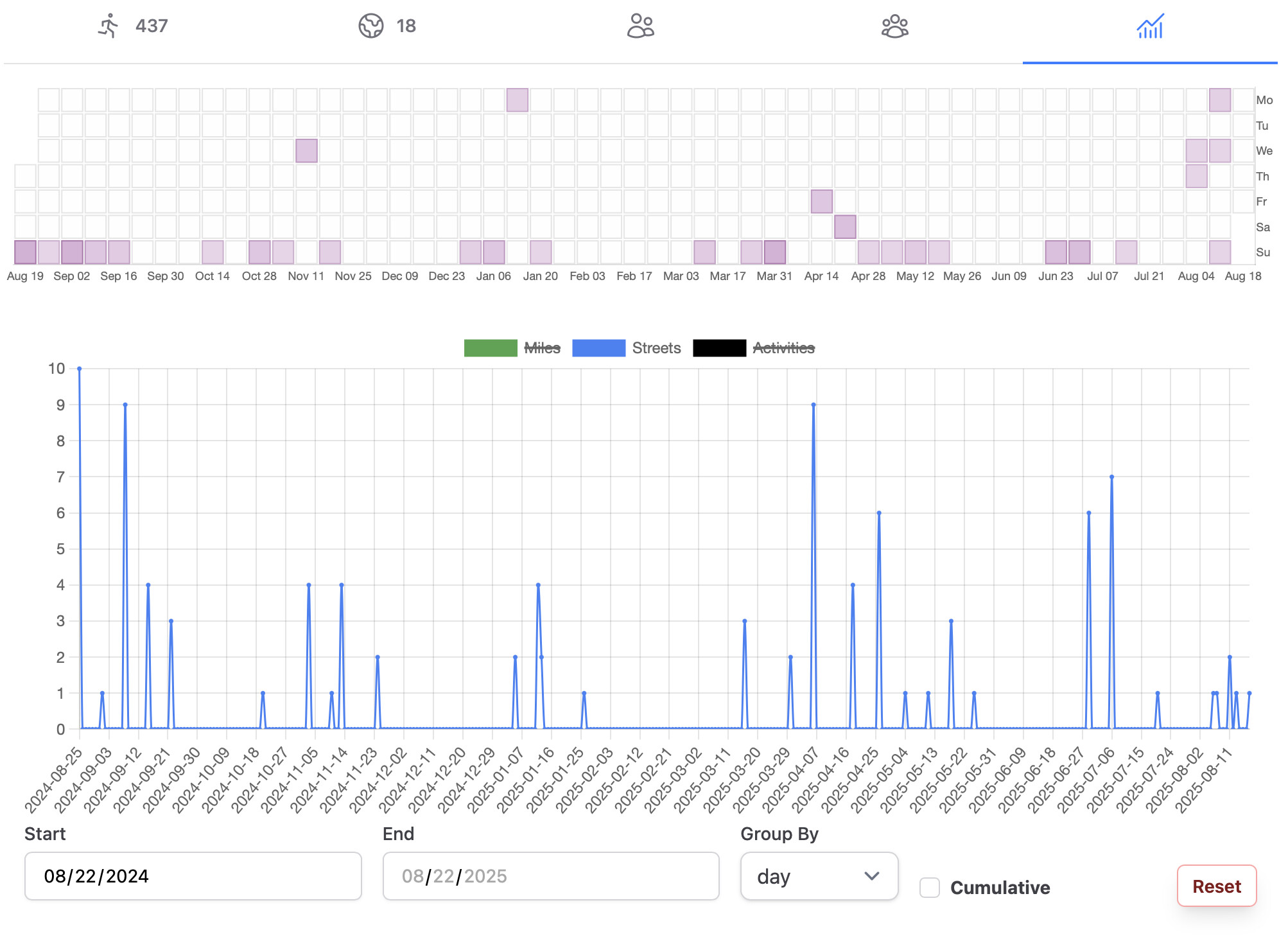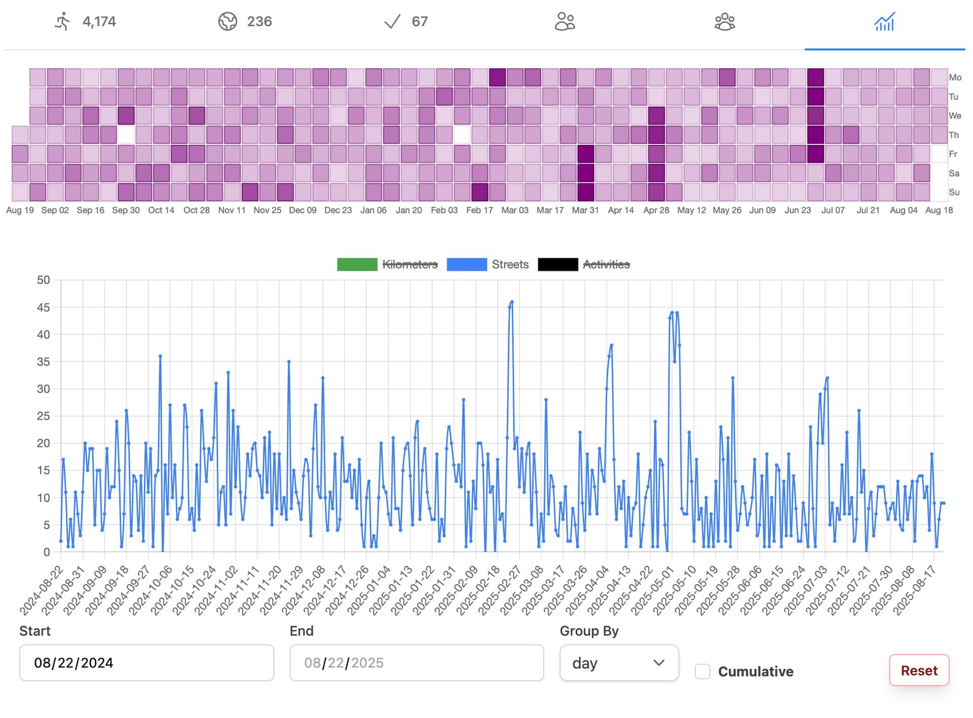 I’ve had this idea of adding a new chart to our profile pages that’s a bit like GitHub’s contribution graph, if you’re familiar with that. I got something working over the past couple days, and I added it above our existing chart. The data goes back one year from the current date, with each day represented as a block that’s darker in color the more streets were completed on that day. Hovering over the block displays its date and the count of completed streets. Oh, and if you have multiple actives in one day that each complete some streets, the sum of completed streets across all the activities is graphed.