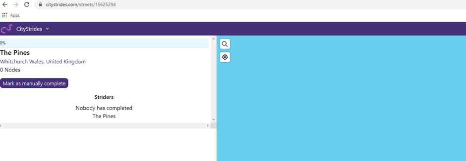 Here’s an example, Whitchurch. I’ve completed all but a road called The Pines. When I click on “Show” citystrides does not display the nodes on the map.