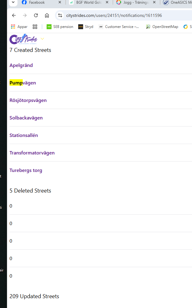 Something seems to be wrong with the notifications now. A just got an update note for Sollentuna looking like this. Deleted streets just show 0. Looking closer at some of the new streets I find that Pumpvägen and Solbackavägen are just name corrections, used to be Pumphusvägen and Solbacksvägen. So these old names should be seen under Deleted streets. Same thing for Järfälla that was also updated today.